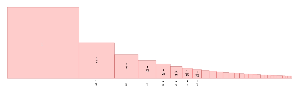 La somme des inverses des entiers naturels non-nuls (la série harmonique) tend vers l’infini (voir ici pour la preuve de Nicole Oresme). On dit que la série est divergente. Ainsi, \[\lim_{n\to \infty}\sum_{i=1}^{n}\frac{1}{i}=\infty\]Le grand Euler a montré (une première fois à vingt-huit ans dans une preuve particulièrement eulérienne en 1735, puis à nouveau avec une preuve plus rigoureuse en 1741) que la somme des inverses des carrés des entiers naturels non-nuls converge vers une valeur, aussi surprenante soit-elle d’ailleurs, cette valeur. C’est le problème de Bâle. On écrit \[\lim_{n\to \infty}\sum_{i=1}^{n}\frac{1}{i^{2}}= \frac{\pi^{2}}{6}\]Deux séries intimement liées, l’une divergente, l’autre convergente. Avec cette malice toute mathématique, on décide d’accoler un carré de côté \(1\) et d’aire \(1\) à un carré de côté \(\frac{1}{2}\) et d’aire \(\frac{1}{4}\). On accole ensuite un carré de côté \(\frac{1}{3}\) et d’aire \(\frac{1}{9}\). Puis on accole un carré de côté \(\frac{1}{4}\) et d’aire \(\frac{1}{16}\). On continue le processus aussi longtemps qu’on le souhaite tel qu’illustré dans l’image ci-dessous …
