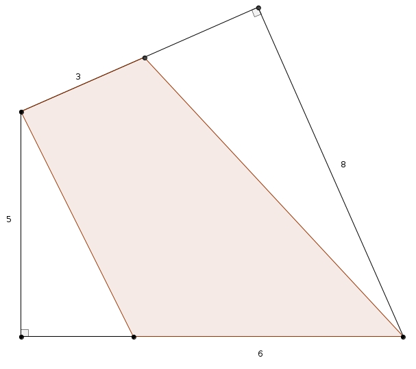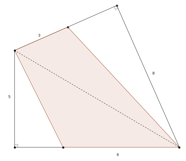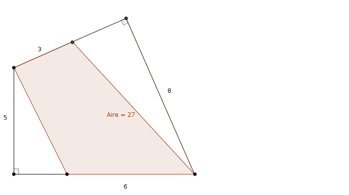 On se retrouve avec deux triangles dont les hauteurs tombent à l’extérieur du triangle, sur le prolongement du côté opposé. Le premier triangle a une base de \(6\) et une hauteur de \(5\), le deuxième triangle a une base de \(3\) et une hauteur de \(8\) (plus difficile à voir). L’aire de la région ombrée est donc de \[\frac{6\times 5}{2}+\frac{3\times 8}{2} = 15 + 12 = 27\]Voilà ! Ça parait si simple !